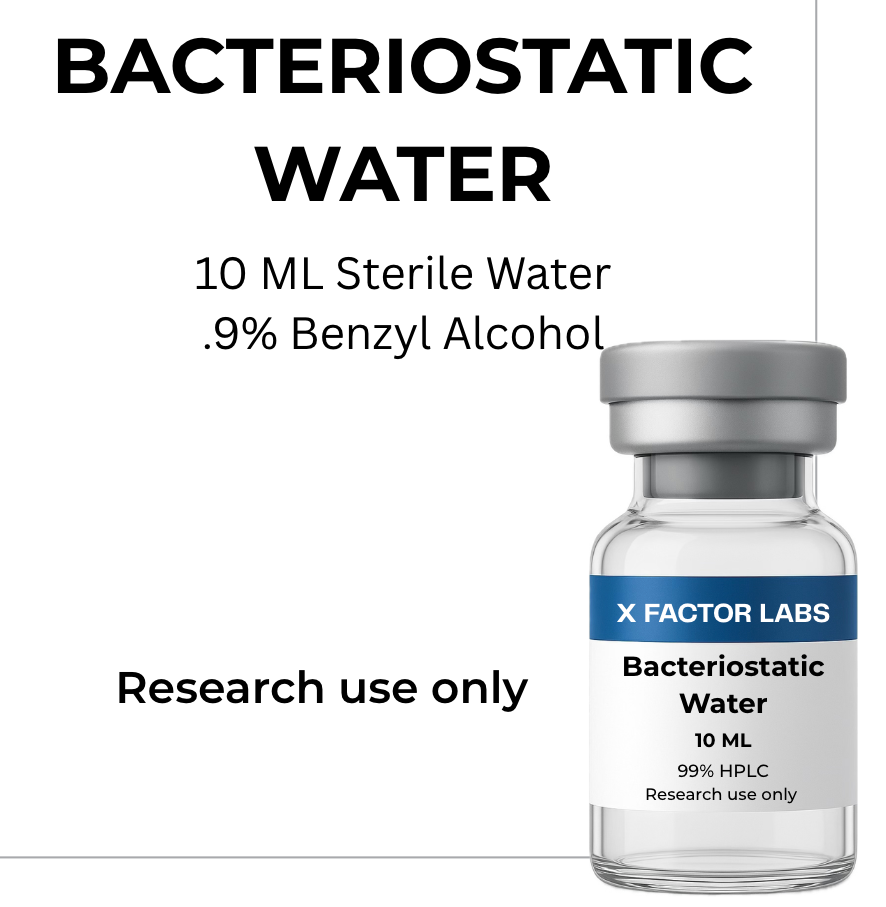 Bacteriostatic Water (BAC Water) is sterile, non-pyrogenic water intended solely for use in diluting or dissolving substances for laboratory research. It contains 0.9% benzyl alcohol as a bacteriostatic preservative, which inhibits the growth of most potentially contaminating microorganisms. BAC Water is frequently used in research protocols to reconstitute lyophilized compounds due to its extended multi-use stability and compatibility with a wide range of research peptides and proteins.