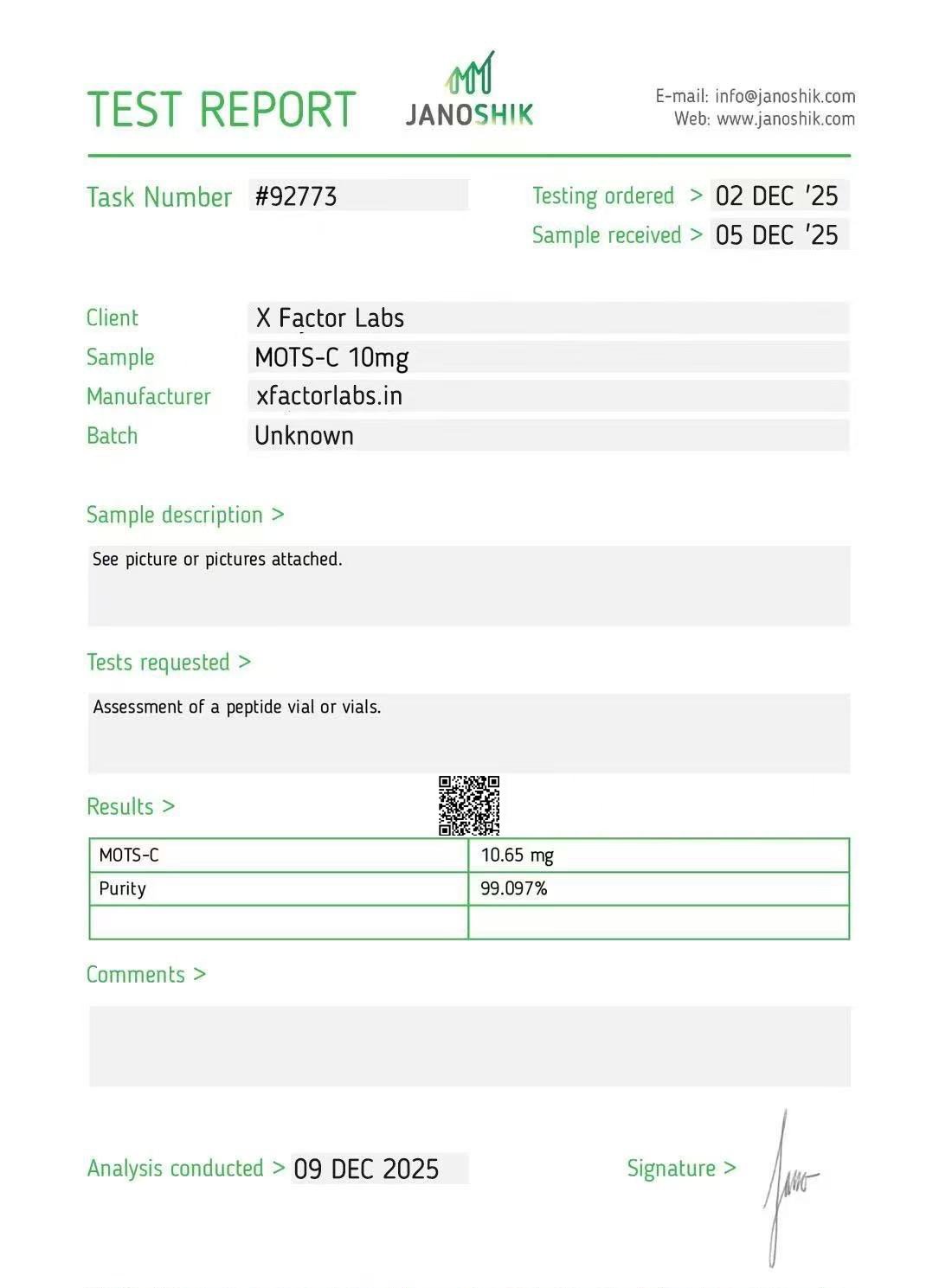 MOTS-c is a 16-amino acid mitochondrial-derived peptide (MDP) encoded within the 12S rRNA region of mitochondrial DNA. It has gained attention in research for its regulatory role in cellular metabolism, particularly in glucose utilization, fatty acid oxidation, and mitochondrial function. MOTS-c is commonly studied in in vitro models examining metabolic signaling pathways, stress resistance, and AMPK activation. Due to its mitochondrial origin, it is also a subject of interest in age-related and metabolic disorder research.
