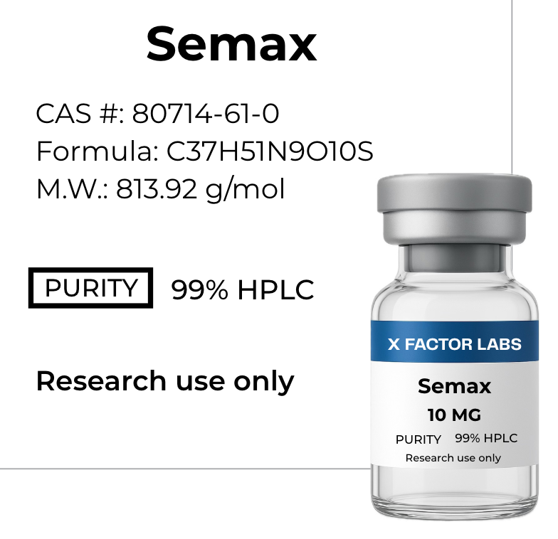 Semax has been studied for its interactions with the central nervous system and its potential role in modulating neurochemical pathways. Research has explored its impact on neurotransmitter regulation, neuronal plasticity, and gene expression associated with neurotrophic factors. In experimental models, Semax is often evaluated for its potential to influence cognitive function, stress response, and neuroprotection.