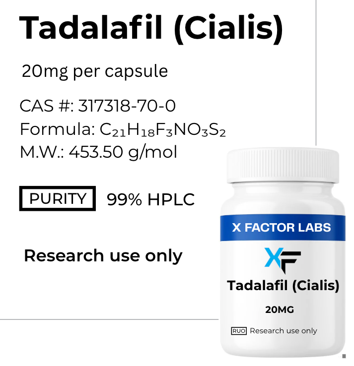 Research applications frequently explore Tadalafil’s role in blood flow regulation, smooth muscle relaxation, cardiovascular dynamics, and nitric oxide–dependent biochemical pathways. Due to its extended half-life relative to other PDE5 inhibitors, Tadalafil is also used in studies assessing sustained cGMP elevation and prolonged vasorelaxation effects.